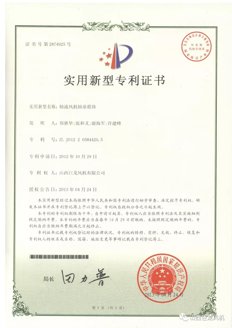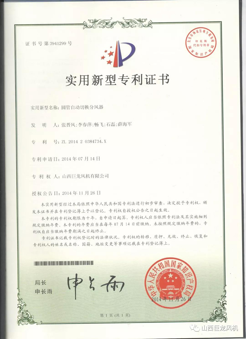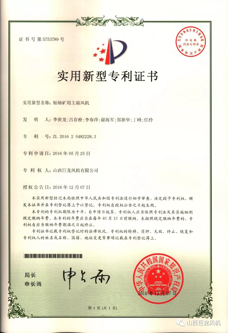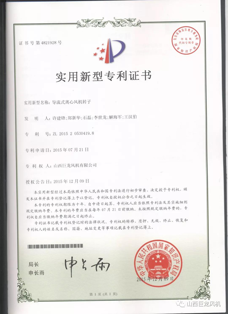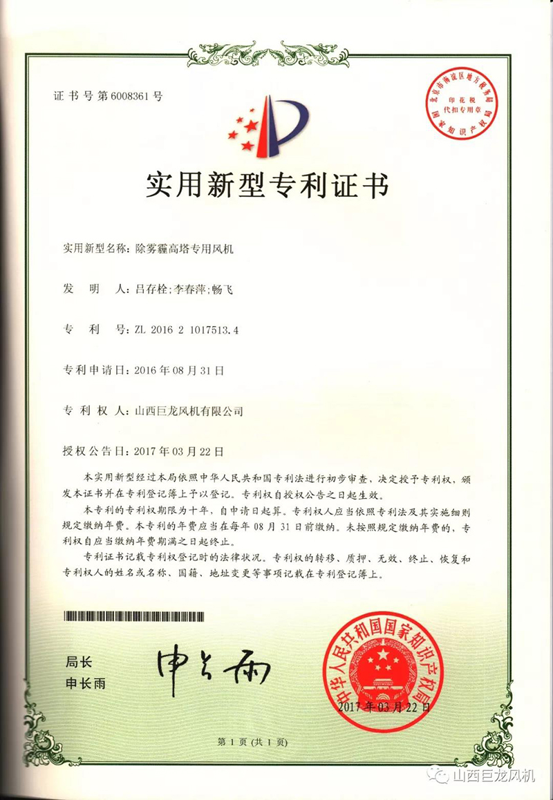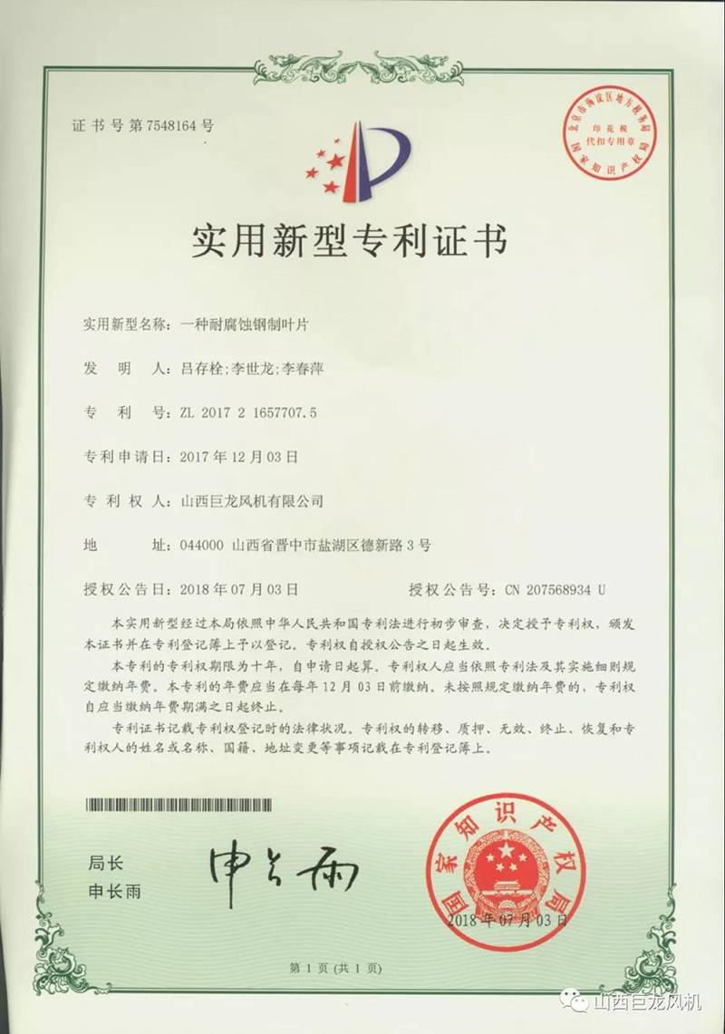 【山西巨龍風(fēng)機(jī)有限公司】——專利證書