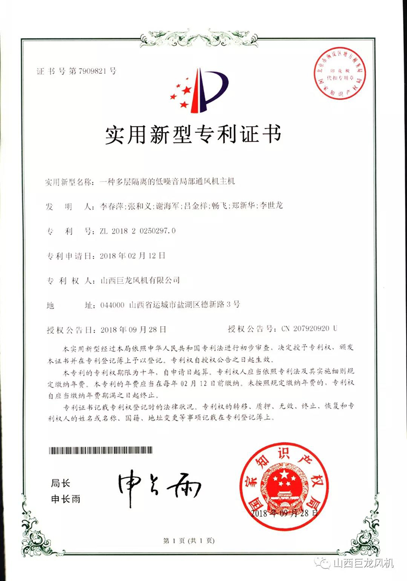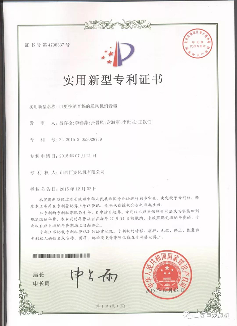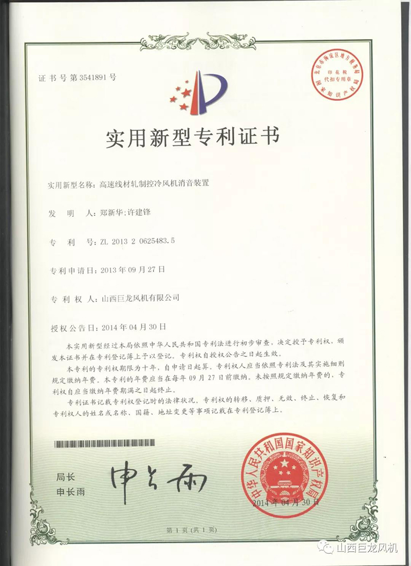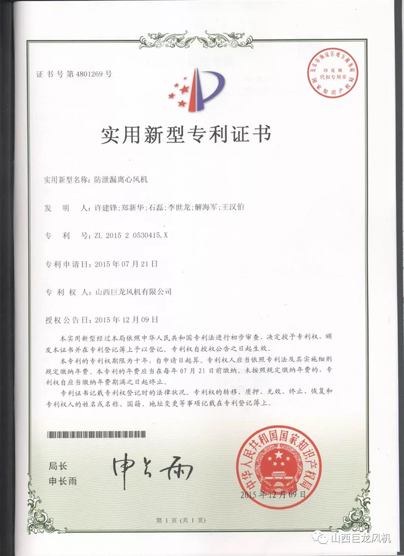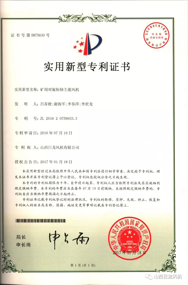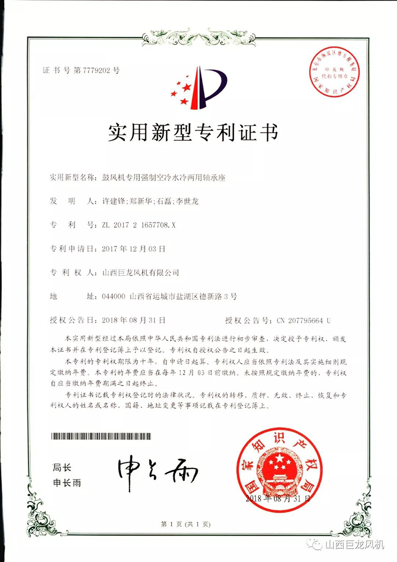 【山西巨龍風(fēng)機(jī)有限公司】——專利證書
