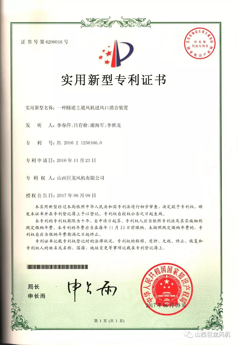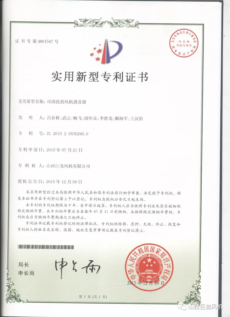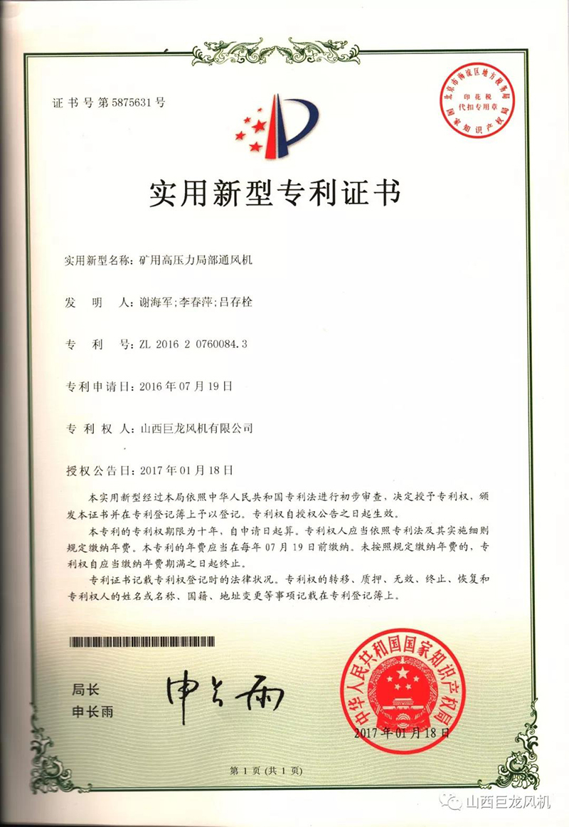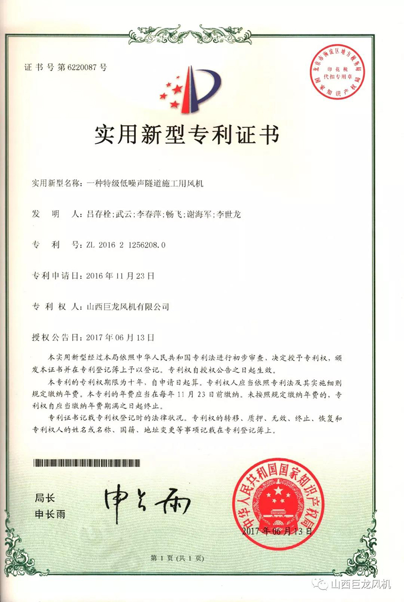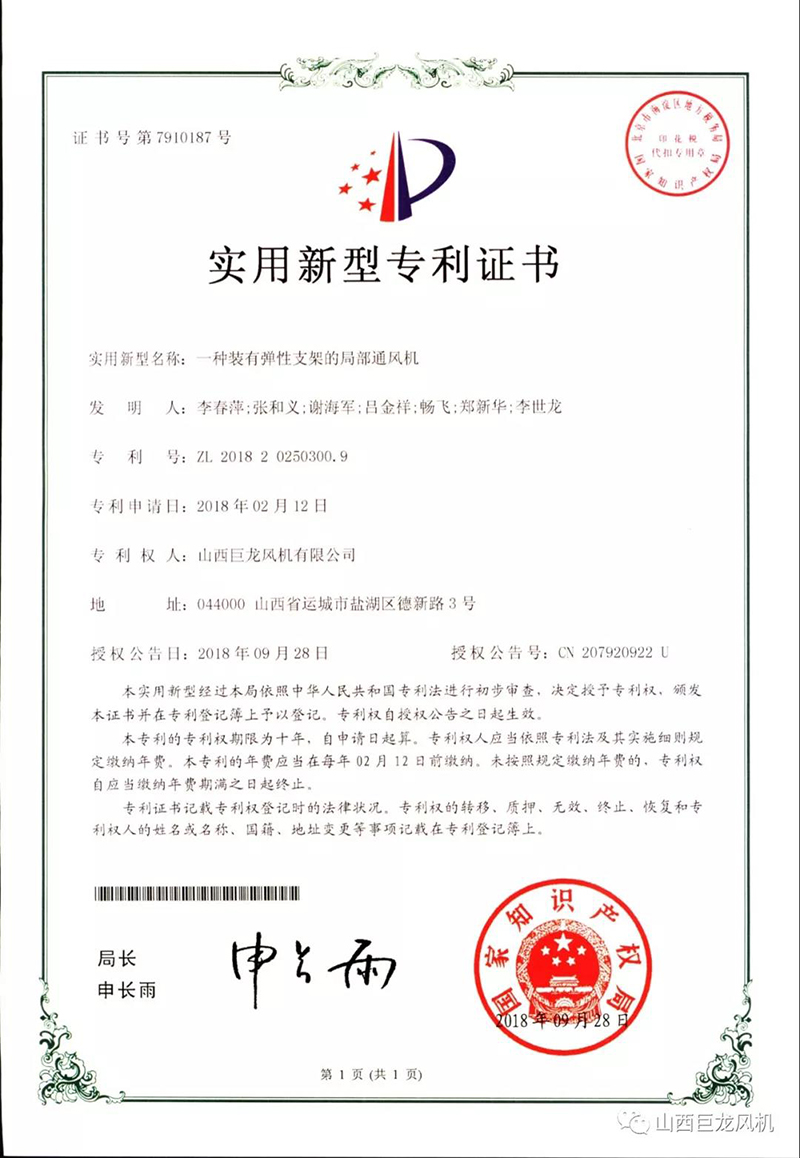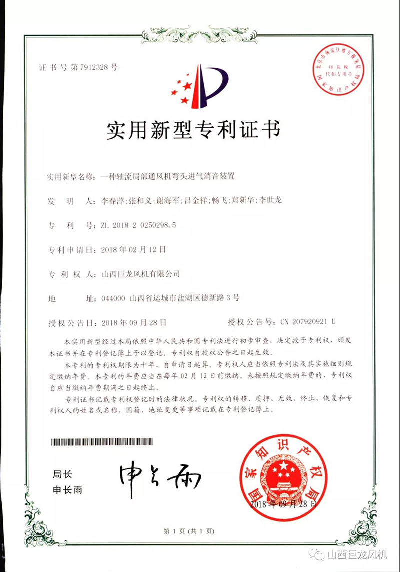 【山西巨龍風(fēng)機(jī)有限公司】——專利證書