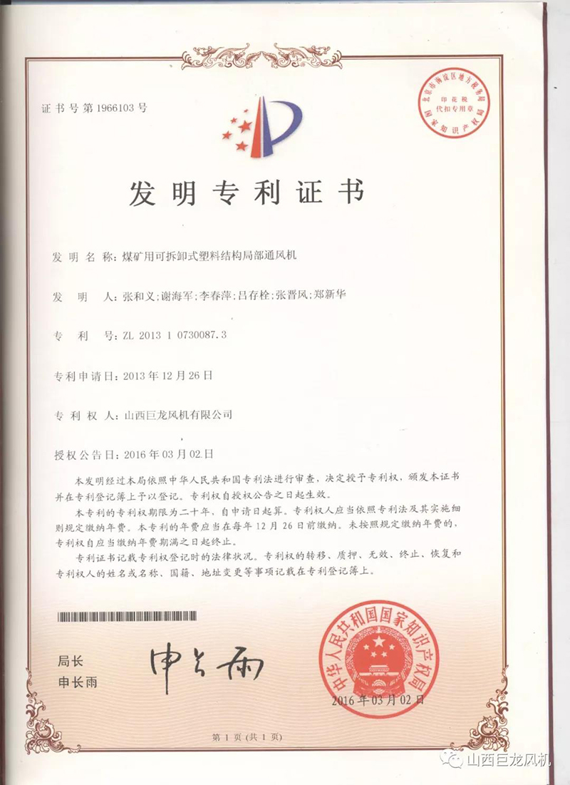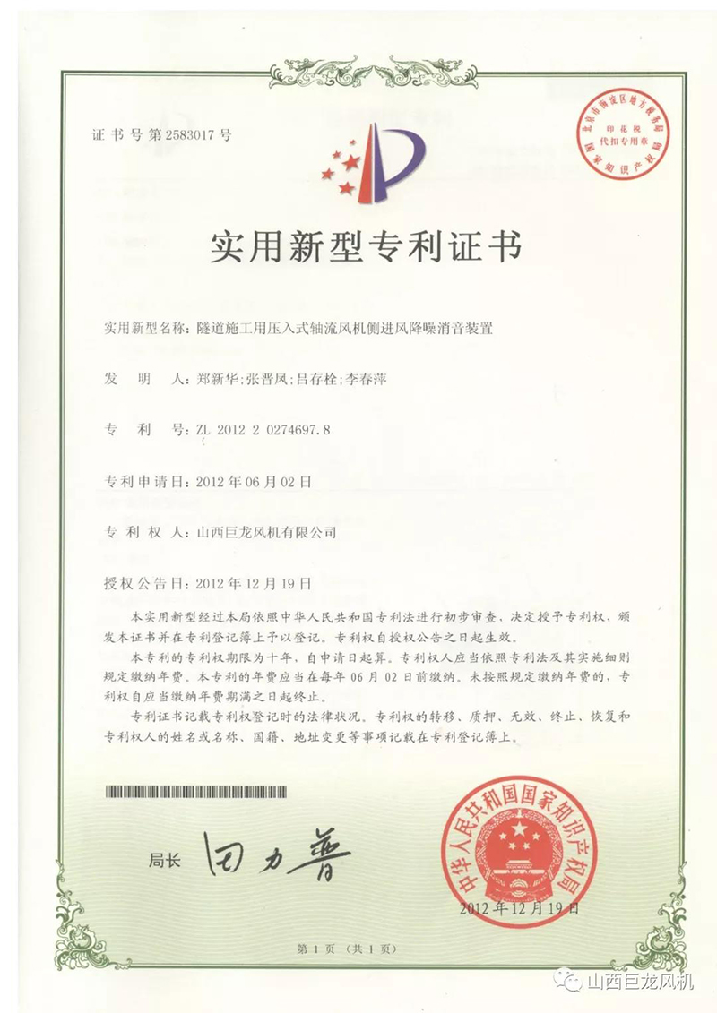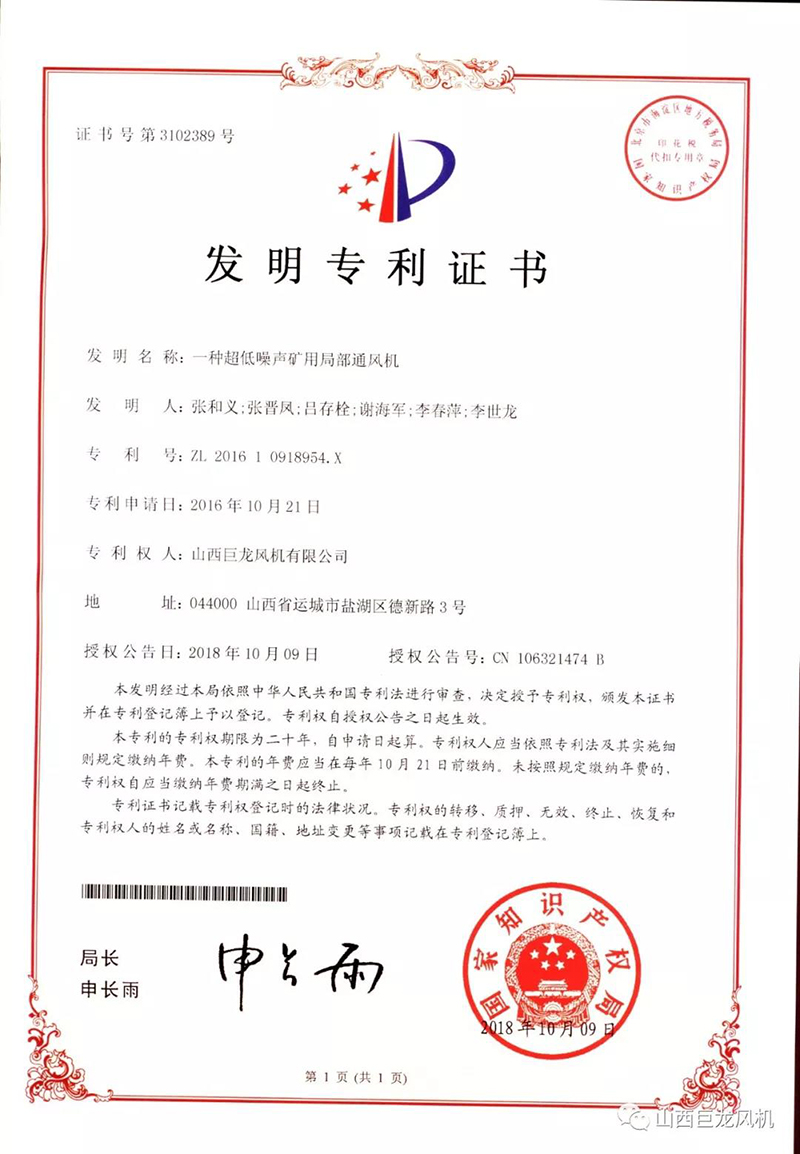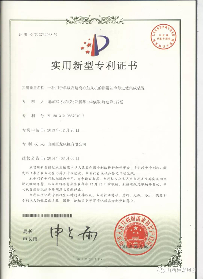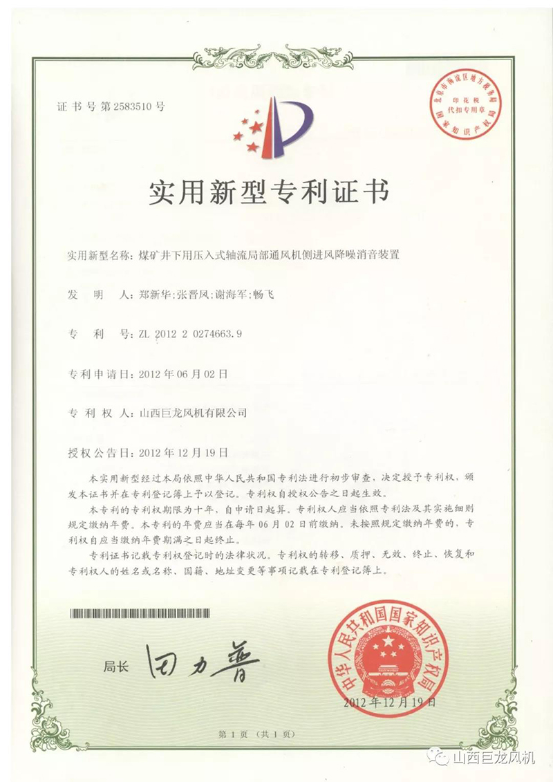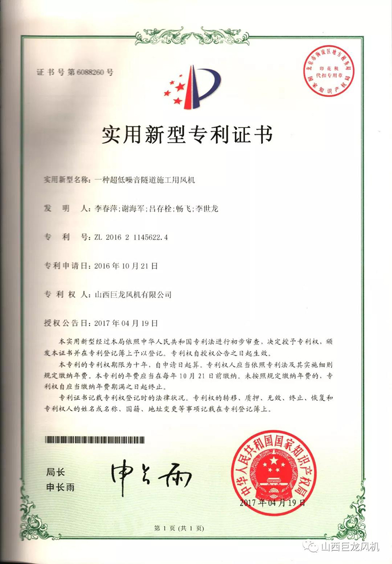 【山西巨龍風(fēng)機(jī)有限公司】——專利證書